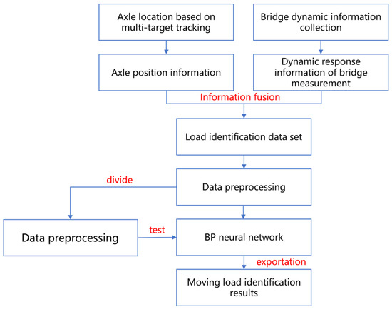 For the past few years, BP neural network technology has attracted the attention of many scholars because of its wide applicability and strong adaptive ability. Since different input parameters will produce different results, Zhao Yu et al. [13] analyzed the reasons and found that acceleration as the input parameter of the neural network can improve the stability of the recognition process, while the combination of speed and acceleration can achieve better results. For the more sensitive strain, Yang Hui et al. [65] took it as an input parameter to study the impact of different training networks and function combinations on the force identification results. The results showed that the strain parameters could effectively identify vehicle information, and the recognition accuracy was only slightly affected by the function combinations, but different training networks would have a greater impact on the recognition accuracy. Wan [66] carried out a study on the influence of different sample parameter combinations on the accuracy and efficiency of bridge moving force identification. The results showed that the BP neural network was reliable when using mixed samples of deflection and strain to provide input parameters. In order to expand the application of BP neural network technology, Tao Xing-wang et al. [67] took a cable-stayed bridge as the research object and adopted neural network technology to identify the force of heavy vehicles running on the bridge. The results showed that the identification error of vehicle weight and speed was small, and the network training output was good. Wang Xiao-hui [68] proposed a hierarchical recognition method of bridge moving load based on a BP neural network based on a Whale Optimization Algorithm (WOA) and built a moving load parameter recognition model based on a WOA-BP neural network. Sun Zong-guang et al. [69] took the operating cable force as the data test object and analyzed the change in cable force time history based on neural network technology so as to identify vehicle weight and vehicle speed. The results showed that the identification results of vehicle weight, vehicle speed and joint distribution were consistent with the reality. Subsequently, Yuan Biao [70] proposed the YOLOv5Deep SORT-BP (YD-BP) moving force recognition method based on deep learning and multi-source information fusion. Taking the wheel as the detection and tracking target, the real-time spatial position of the axle was located. Then, the location information on the axle was integrated with the dynamic response information on the bridge. Finally, the two parts of information were fused to identify the dynamic load of the vehicle on the bridge by using the powerful nonlinear high-fitting mapping capability of the BP neural network. The implementation steps of YD-BP force recognition are shown in Figure 4.