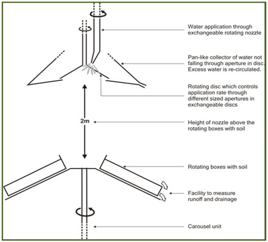 In both experiments, a rotating disc rainfall simulator facilitated the imposition of storms with varying intensities and slope gradients on three distinct soil types. Each rain-simulator tray measured 60 cm × 30 cm × 5 cm and accommodated up to 5 kg of soil, with a maximum applied intensity of 150 mm/h. These trays were equipped with perforations for water collection and lined with selectively permeable cloth to prevent soil passage, crucial for maintaining experimental integrity. Upon soil processing, the soil was meticulously deposited into the trays, ensuring full capacity to enable unobstructed runoff. Pre-wetting of the soil with tap water at a conductivity of 0.7 dS/m preceded exposure to rainfall.