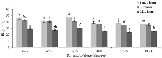 The impact of rainfall intensity (RI), slope gradient, and soil properties on infiltration rate (IR). Bars sharing the same letter indicate no significant differences.