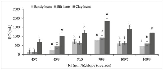 Effects of soil type, rainfall intensity (RI), slope gradient, and soil property on runoff (RO). Bars with the same letter are not significantly different.