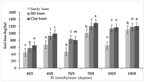 Effects of soil type, rainfall intensity (RI) and slope gradient on soil loss (SL). Bars with the same letter are not significantly different.