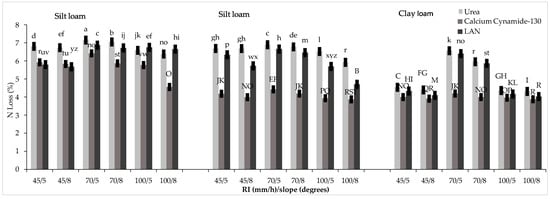 During a rainfall event, nitrogen can be lost through two mechanisms. The first involves surface runoff, which happens when the rate of rainfall exceeds the soil’s capacity to absorb it. The second mechanism involves the vertical movement of nitrogen through infiltration. This study focused specifically on examining the vertical leaching loss of nitrogen, omitting the investigation of nutrient loss through runoff. Leaching losses of total N were significantly influenced by rainfall intensity, slope, and soil type, with higher intensity leading to increased N leaching (Table 6). Results revealed that all soils experienced peak N loss at 70/5 intensity, particularly sandy loam (Figure 5). Interestingly, different nitrogen sources had varying effects; urea at 130 kg/ha N resulted in the highest N loss in all three soil types (7.15% sandy loam, 6.9% silty loam, and 6.5% clay loam), followed by LAN at 130 kg/ha N (6.9% sandy soil, 6.7% silt loam, and 6.3% sandy loam) while at the same level CaCN2 at 130 kg/ha N exhibited lower N leaching (6.4% sandy soil, 4.4% silt loam, and 4.2% clay loam) due to its slow-release nature. By comparison, Mrubata et al. [29] discovered that the variation curves of the total N loss under the rainfall intensities of 30 mm/h and 40 mm/h showed no noticeable difference, which may be due to the small effect of the low rainfall intensity on soil nutrient loss rate.