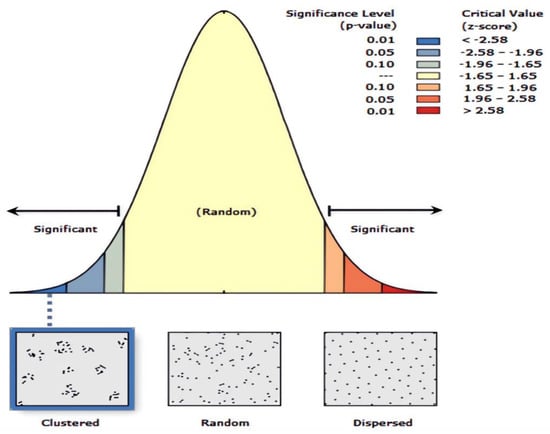 Moran’s I index is an indicator for spatial auto correlation, which takes into account geographical spatial factors and ranges from 0 to 1. Moran’s I index calculates the correlation between eigenvalues and surrounding eigenvalues, allowing us to compare the spatial similarity of different regions. It can determine whether a spatial dataset has a trend of spatial clustering or spatial random distribution. The calculation for Formula (3) is [30]