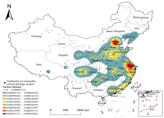 Cai, Z.; Cai, K.; Huang, T.; Zhang, G.; Chen, R. Spatial Distribution Characteristics and Sustainable Inheritance Strategies of National Traditional Fine Arts Intangible Cultural Heritage in China. Sustainability 2024, 16, 4488. https://doi.org/10.3390/su16114488