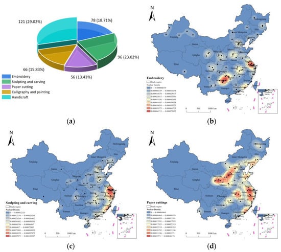 Figure 4. Pie and density maps for feature analysis of ICHA projects with different factors. (a) ICHA quantitative analysis of five types; (b) embroidery nuclear density analysis map; (c) sculpting and carving nuclear density analysis; (d) Paper Cutting nuclear density analysis map; (e) calligraphy and painting nuclear density analysis; (f) handicraft nuclear density analysis map.