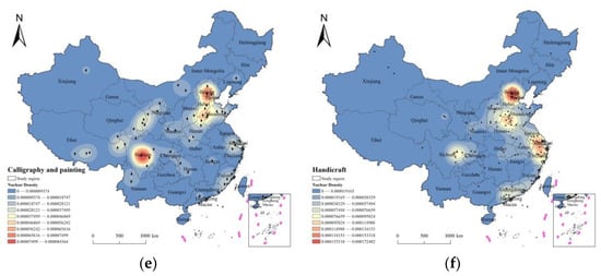 Figure 4a indicates that the number of embroidery, sculpture and carving, Paper Cutting, calligraphy and painting, and handicraft projects is 78, 96, 56, 66, and 121, respectively, accounting for 18.71%, 23.02%, 13.43%, 15.83%, and 29.02%. The distribution map of embroidery ICHA projects in Figure 4b displays two primary core zones: one centered around the Jiangsu–Shanghai intersection, and the other around the intersection of Hunan, Xiangxi, and Guizhou. Figure 4c depicts the distribution map of sculpture and carving ICHA projects, featuring a main core zone centered around Shanghai radiating to Jiangsu and Zhejiang provinces, and a sub-core zone along the coastal areas of Fujian province. The core zone of the Paper Cutting ICHA projects in Figure 4d exhibits a belt-shaped distribution, with the primary core zone spanning eastern Jiangsu Province, Zhejiang Province, Shaanxi Province, and the Ningxia Region, and secondary core zones along the coastal areas of Fujian Province, Guangdong Province, and Hubei Province. The distribution of calligraphy and painting ICHA projects in Figure 4e is scattered, with a relatively concentrated distribution in the central region, particularly around Sichuan and Beijing. Figure 4f illustrates that handicraft ICHA projects are mainly concentrated in the core zones of Beijing and Shanghai, with a secondary density zone at the intersection of Shandong Province and Henan Province.