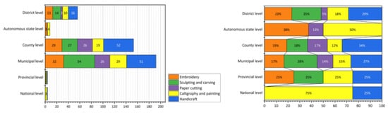 As depicted on the left side of Figure 5, there are six levels: national, provincial, municipal, county, autonomous prefecture, and district level. ICHA projects are primarily concentrated at the municipal and county levels, comprising 192 and 153 projects, respectively, amounting to a total of 82.74%. There are four national-level ICHA projects, all designated as protected units in Beijing, the capital city. Among these, three fall under the category of calligraphy and painting, and one under handicraft. There are four provincial-level ICHA projects, encompassing one each for embroidery, sculpture and carving, calligraphy and painting, and handicraft. At the municipal level, there are 32 embroidery projects, 54 sculpture and carving projects, 26 Paper Cutting projects, 29 calligraphy and painting projects, and 51 handicraft projects. County-level ICHA projects comprise 29 embroidery projects, 27 sculpture and carving projects, 26 Paper Cutting projects, 19 calligraphy and painting projects, and 52 handicraft projects. Autonomous prefectures host eight ICHA items, including three calligraphy and painting items, three embroidery items, and one Paper Cutting item. District-level ICHA projects amount to 56, encompassing 13 embroidery projects, 14 sculpture and carving projects, 3 Paper Cutting projects, 10 calligraphy and painting projects, and 16 handicraft projects. As shown on the right side of Figure 5, only calligraphy and painting ICHA projects are present at all six levels, whereas embroidery, sculpture and carving, and handicraft projects are predominantly concentrated at the municipal and county levels.
