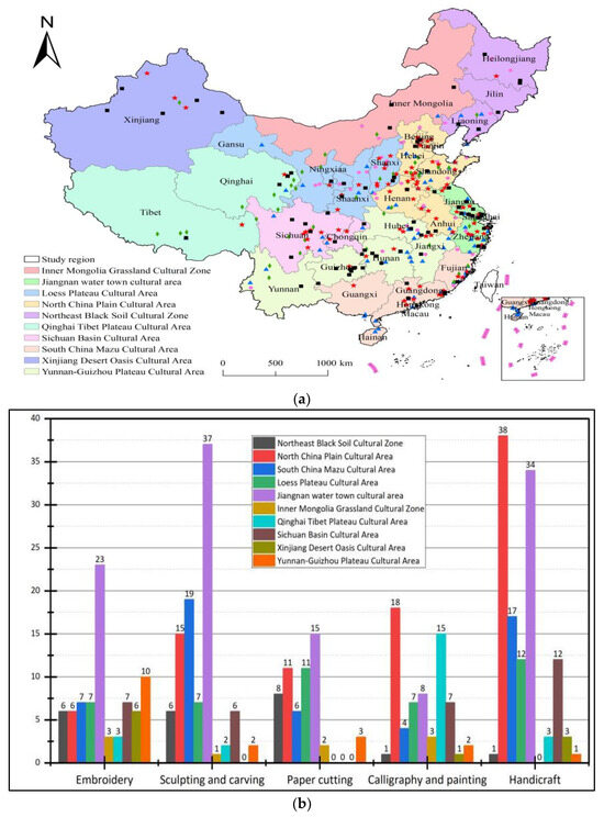 Figure 6. (a) ICHA distribution map of cultural zone spatial projects; (b) number of five types of ICHA projects in each cultural zone.