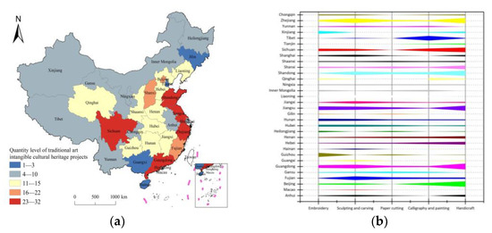 The 417 ICHA projects are distributed in 32 provincial-level administrative regions, covering 94.12% of 34 provinces and municipalities directly under the central government (including Hong Kong, Macao, and Taiwan). The geographical concentration index of the ICHA project is G = 21.19, and the theoretical average geographical concentration index is 17.15, indicating that the national art intangible cultural heritage projects are clustered and distributed at the provincial level. The imbalanced index S = 0.14 indicates that the distribution of artistic intangible cultural heritage in various provinces is uneven. Figure 7a divides the number of ICHA projects in each province into five levels. Guangdong, Jiangsu, Zhejiang, Shandong, and Sichuan provinces belong to the first level, with Guangdong Province having the highest number of 32, accounting for 7.7% of the national total; next are Jiangsu Province and Zhejiang Province, with 31 and 30, respectively, accounting for 7.4% and 7.2% of the national total. Beijing, Fujian Province, and Shaanxi Province are classified as second-tier cities in terms of quantity. The ten central provinces are divided into three levels, while the fourth level is distributed in the western and northern provinces of China. Tianjin City, Guangxi Province, Hainan Province, Jilin Province, and Macau, with the lowest number, belong to level 5, with a total of 11, accounting for 2.64% of the total national quantity. As shown in Figure 7b, the allocation of five types of projects is uneven among 32 provinces and municipalities, with only 13 regions out of 32 provinces and municipalities having all five types of ICHA projects. There are 10 provinces without projects in the Paper Cutting category, 8 provinces without projects in the calligraphy and painting category, 6 provinces without projects in the handicraft category, and 5 provinces without projects in the embroidery and sculpture and carving category. But there are more than 10 projects in the handicraft category in Guangdong, Zhejiang, Beijing, Jiangsu, and Shandong, with 10 projects in the handicraft category in Sichuan, the calligraphy and painting category in Tibet, and the sculpture and carving category in Zhejiang. Hainan Province and Macau have two and one projects in the sculpture and carving category, respectively, while the other four categories have no projects.