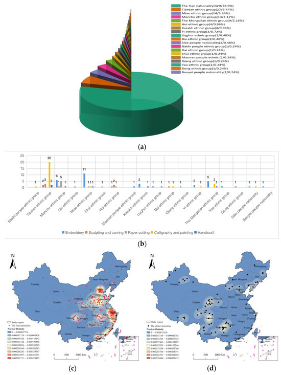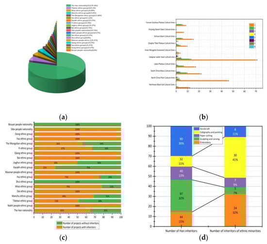 Figure 10. Ethnic analysis chart of ICHA project inheritors. (a) Pie-shaped data chart of ICHA projects with inheritors from various ethnic groups. (b) Bar chart of the number of ICHA projects with 1–8 inheritors from different ethnic groups. (c) Bar scale chart of the number of ICHA projects among different ethnic groups with or without inheritors (d) Bar scale diagram of ICHA project inheritors from Han and ethnic minority groups.