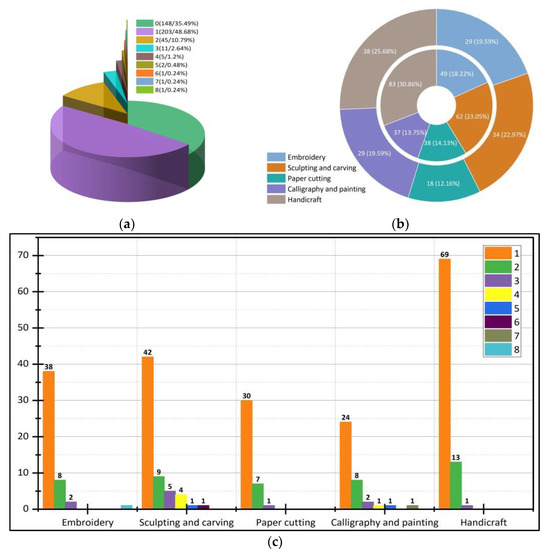 The transmission and development of inheritors from generation to generation is crucial for the inheritance and development of ICHA projects. The generation gap of inheritors has resulted in the loss of space for the development of intangible cultural heritage. However, there are only 377 inheritors in a total of 417 ICHA projects. According to Figure 10a, out of 269 ICHA projects with inheritors, there are 213 Han ICHA projects and 56 ethnic minority ICHA projects. These 56 ethnic minority ICHA projects come from 16 ethnic minorities. As shown in Figure 10b, the inheritors of ethnic minority ICHA projects are mainly single inheritors, but the Tibetan people have one ICHA project with seven inheritors and two ICHA projects with three inheritors. In Figure 10c, compared to the ethnic minorities in 18 ICHA projects, there are eight ethnic minorities with inheritors in each ICHA project. The proportion of ICHA projects without inheritors among the Kazakh, Tibetan, and Mongolian ethnic groups is lower than that of Han ethnic groups. In Figure 10d, Han inheritors are mainly sculptors and carvers. However, the inheritors of ethnic minorities are also sculptors, carvers, and Paper Cutters. The number of inheritors of calligraphy and painting projects from ethnic minorities accounts for the largest proportion, which is close to the number of inheritors from Han ethnic groups.