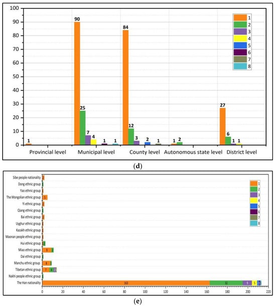 Figure 9. Nuclear Density and Data Analysis Chart of ICHA Projects’ ethnic distribution. Ethnic analysis of ICHA inheritors. (a) Pie chart of the number of ICHA projects with 0–8 inheritors. (b) Comparison pie chart of whether there are inheritors in different classification types of ICHA projects (the inner circle is for projects with inheritors, while the outer circle is for projects without inheritors). (c) Bar chart of the number of ICHA projects of different classification types with 1–8 inheritors. (d) Bar chart of the number of ICHA projects at each classification level with 1–8 inheritors. (e) Bar chart of the number of ICHA projects in each cultural zone with 1–8 inheritors.