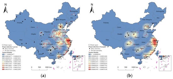 Figure 11. Nuclear density maps of ICHA project inheritors. (a) Nuclear density distribution map of ICHA projects with 1 inheritor. (b) Nuclear density distribution map of ICHA projects with 2–8 inheritors.