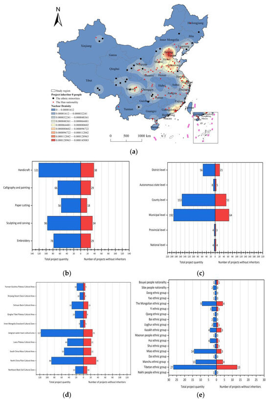 Figure 12. Nuclear Density and Data Analysis Chart of ICHA projects without inheritors. (a) Distribution map of ICHA projects with 0 inheritors. (b) Comparison of 5 types of total projects and projects without inheritors. (c) Comparison chart of six classification levels of total projects and projects without inheritors. (d) Comparison of total ICHA projects and ICHA projects without inheritors in 10 major cultural zones. (e) Comparison between the total number of projects of ethnic minorities and those without inheritors.