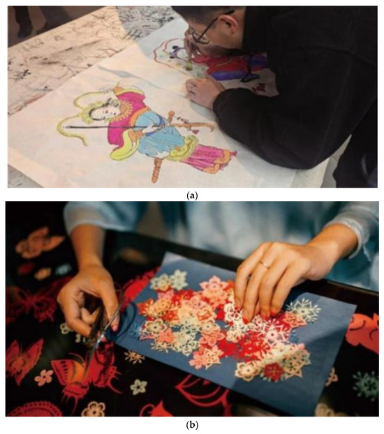 Among the ten major categories of ICH, ICHA tourism products are easier to develop, produce, and trade, making ICHA one of the main forces that enriches the connotation of tourism products. By using the principal component analysis method for the three Huizhou carving types, the results show a significant positive correlation between tourism and aesthetics, and the inheritance inclination of traditional handcrafts [32]. The county-level project of Regong Art in the Tibetan Plateau Cultural Zone has six inheritors. The location of Regong Art in Huangnan County, Qinghai Province, fully utilizes the central idea of “shaping tourism with culture and highlighting culture with tourism”, and utilizes cluster advantages to create local cultural and tourism brands. A demonstration zone for the integration of culture and tourism development has been established. Huangnan County, Qinghai Province, represented by Tangka, integrates ICHA products such as embroidery, clay sculpture, and carving. The key to inheriting intangible cultural heritage lies in the inheritors, and the key to mobilizing the inheritors’ enthusiasm for inheritance lies in improving their survival and creative conditions. Huangnan County drives the cultivation of inheritors through the tourism industry, motivates the local population to engage in related industries, and promotes the integration of traditional art intangible cultural heritage and tourism to explore deeper and further levels. In terms of tourism experience, the advantages of intangible cultural heritage in tourism categories are mainly reflected in handicrafts, folk festivals, and skill performances [15]. For example, Figure 13a,b show the inheritance of industrial development from a static single mode of display and shopping to a dynamic integrated system of interaction and experience. Tourism not only drives the learning motivation and enthusiasm of inheritors, but also deepens the sustainable inheritance and dissemination of ICHA.