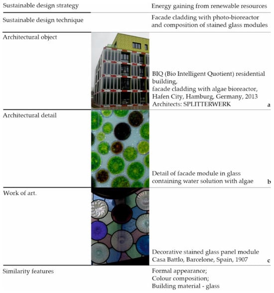 Formal associations between a system for gaining renewable energy with a bioreactor on a façade and a stained-glass composition. Photos by M. Celadyn (a,b) (2015), and by T. Hisgett (c). Source: https://commons.wikimedia.org/w/index.php?curid=18656944 (accessed on 3 March 2023), Licensed under the terms of cc-by-2.0.