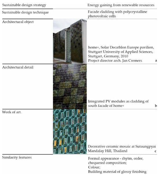 Formal associations between a system for gaining renewable energy by way of polycrystalline photovoltaic cells on a façade and a ceramic mosaic. Photos by M. Celadyn (2012) (a,b), and by Photo Darma and Sadao, Thailand (c). Source: https://commons.wikimedia.org/wiki/File:015_Decorative_Mosaic_at_Sutaungpyai,_Mandalay_Hill_(8910934843).jpg (accessed on 10 March 2023), Licensed under the terms of CC-BY-SA-2.0.