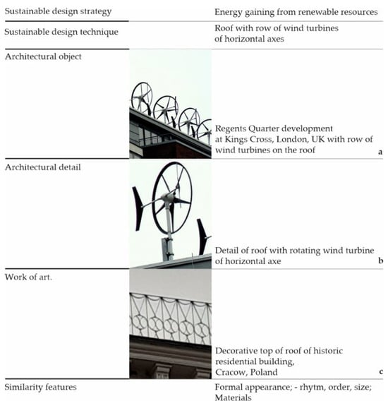 Formal associations between wind turbines on a contemporary office building for accomplishing the postulate of gaining energy from renewable resources and the architectural details of the roof of a historic building. Photos by Judith (a,b) (2008). Source: https://commons.wikimedia.org/wiki/File:Regent%27s_Quarter_Kings_Cross_2167081596.jpg (accessed on 19 February 2023), Licensed under the terms of the CC-BY-SA-2.0, and by M. Celadyn (c) (2020).