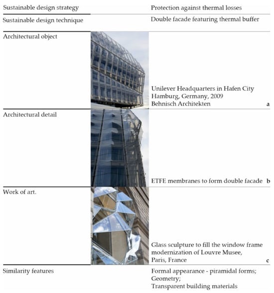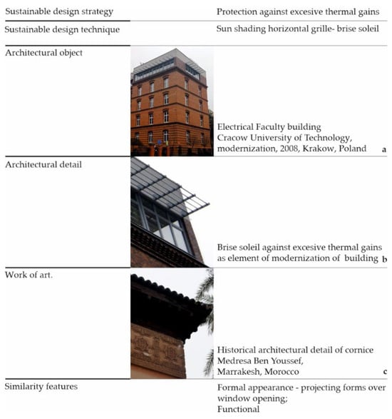 In this study, various architectural details or components—the semiotic aspects of which are analyzed in this way—are compared. Semiotics is a theory and methodology that can be applied to buildings [29], their details, and artworks, which can be viewed as signs. This perspective enables the perception of details and artworks as specifically relevant signs and facilitates the revelation of similarities between couples of both analyzed artifacts. Many examples in which architectural detailing is associated with symbolic meaning can be pointed out. Symbolism is often present in façade design through the use of metamorphic, referential, or analogical devices. Technical details can, in many ways, be associated with such an approach.