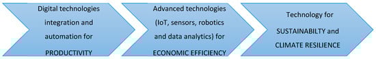 In this context, we explore the evolution of agricultural technology and its conceptualization, as shown in Figure 1. Agricultural technology has been consistently evolving since time immemorial. The initial focus for deploying technology, such as using machinery and tools in agriculture, was to increase productivity. However, with time passing, the type of technology (IoT, sensors, robotics, and data analytics) and the context for using it for agriculture has evolved, for instance, to improve economic efficiency. Recently, the definition of agritech emphasizes environmental sustainability and climate-resilient solutions. Agriculture 4.0 was framed as analogous to Industry 4.0, which signifies digital agricultural transformation [4]. With the onset of information and communication technology, agricultural technology (agritech) started encompassing precision agriculture and data-driven decision-making. Agritech can be defined in today’s agricultural context (Agriculture 4.0) as the use of data-driven smart technologies, analytical methods, drones, robotics, the Internet of Things (IoT), vertical farms, artificial intelligence (AI), and solar energy for enhancing farming practices, operations, and decision-making to achieve the agricultural field’s economic efficiency and environmental sustainability in multiple forms and ways. It is strongly associated with the use of AI applications [5,6,7,8,9]. Therefore, technologies that promote environmental sustainability, resource conservation, and climate resilience are becoming the focus of companies that develop them [10].