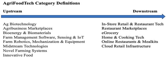 According to the framework for classifying agrifood tech companies provided by the Agfunders Investing Report 2017 [20], the “upstream” agrifood tech includes eight types: Ag Biotechnology; Farm Management Software, Sensing, and IoT; Farm Robotics, Mechanization, and Equipment; Bioenergy and Biomaterials; Novel Farming Systems; SupplyChain Technologies; Agribusiness Marketplaces; and Innovative Food. On the other hand, the “downstream” agrifood tech includes six categories: In-Store Retail and Restaurant Tech, Restaurant Marketplaces, eGrocery, Home and Cooking Tech, Online Restaurant and Mealkits, and Cloud Retail Infrastructure. The movement from upstream to downstream with different types of agrifood tech companies suggests that technology has been deeply embedded into agricultural supply chains.