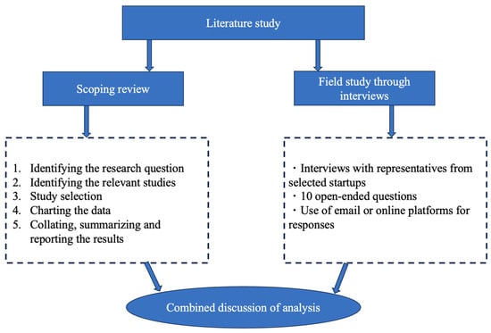 The methodology adopted for this study was a combination of a scoping literature review and a field study through interviews with agricultural startups’ representatives. This mixed-methods approach was chosen to provide a holistic understanding of the data-driven agritech startup ecosystem in India and Japan through both secondary and primary lenses. In the scoping literature review, this study critically reviewed the literature on agritech startups to answer the four main research questions as discussed in Section 1. The aim of the field study, with the employment of interviews, was to obtain insights into the performance of agritech startups as well as the opportunities for the relationship between agritech startups in the two countries.