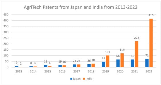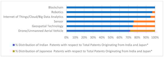 This comparative analysis clearly states that India’s contribution to the Internet of Things and data analytics is very high. In contrast, Japan is not very active in using data analytics, robotics, or blockchain to improve their agricultural activity. Unmanned aerial vehicles and sensors are the areas where India and Japan are actively working, though India is dominating this space with three-quarters of the total India–Japan filings. Geospatial technology for agricultural purposes is a new phenomenon, and both countries have started exploring this space (Figure 6 and Figure 7).