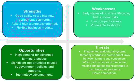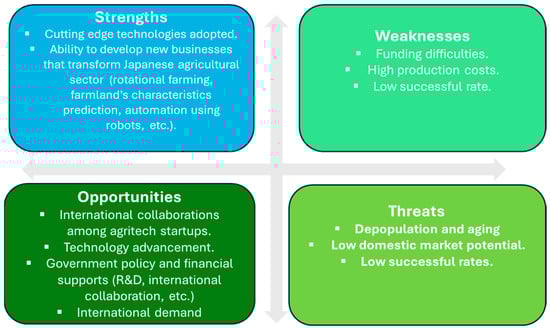 Figure 10 summarizes the strengths, weaknesses, opportunities, and threats of agritech startups in Japan. These firms mostly adopted cutting-edge technologies and were able to develop new business models that transformed the Japanese agricultural sector, such as rotational farming, farmland characteristics prediction, and automation using robots. Nevertheless, these firms have faced funding difficulties and high production costs because of the shortage of natural resources in Japan, as well as high labor costs. The success rate of these firms is also low.