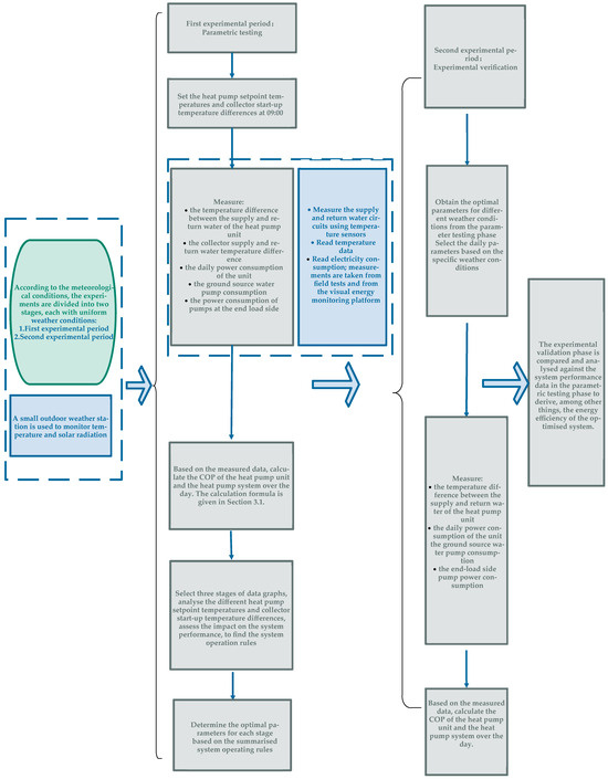 Considering the findings of previous research and investigations, it is noted that solar–ground-source heat pump systems have been gradually improved in terms of feasibility, component design parameters, system integration, operation modes, and control and management strategies. However, the evaluation of different operation modes and control strategies has major financial constraints and time limitations. Thus, the presented research, dealing with the operation modes and control strategies of the system, mostly adopted simulations, theoretical calculations, or simulation-based experimental approaches. In this regard, the use of experimental methods to optimise the system design and operation has been very limited [41]. Additionally, the simulation of the system has mostly focused on the system configuration optimisation, simulation software module optimization, and other aspects related to the solar–ground-source heat pump system, with very limited effort made to adjust the parameters in order to optimise the system performance using experimental methods.