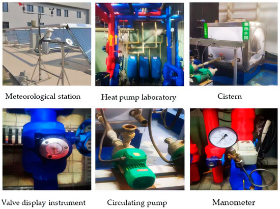 In this study, a weather station was established on the roof of a building to monitor and record data on the climatic weather conditions every minute throughout the day. The temperature setpoint of the heat pump and the collector start-up temperature difference could be adjusted in the experimental setup through the visualisation panel. At 9:00 am every day, the two parameters were set, and they were also adjusted at the same time, taking into account the number of operating points. On this basis, the system’s operating mode could be switched. The heat pump system had temperature sensors at the inlet and outlet of each circuit to monitor and collect temperature data, and different data streams could be read through the system’s visualisation platform. The average evaporator temperature was around 3.5 degrees, and the average condenser temperature was around 37.5 degrees. Additionally, the system was equipped with a screen meter to record the power consumption of the pumps on the ground-source side and the end-load side, among other data. Figure 3 shows the equipment used for the experimental measurements.