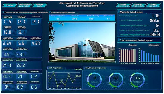 The six periods considered in this study are characterized by different outdoor ambient temperatures and solar radiation intensities, as well as different heat loads and operating characteristics of the heating room. In the first part, parameter testing is carried out, where the aim of this specific method is to change the two operating parameters of heat pump setpoint temperature and collector start-up temperature difference within a reasonable range. In this regard, the inlet and outlet temperatures and pressures of each of the heat pumps, the solar collector, the heat storage tank (load side), and those at the end of the capillary tubes are measured and recorded. The different data streams collected can be obtained through the visualisation platform. Measurement data can be obtained through the visualization platform during project construction (Figure 6). The energy monitoring platform was based on WCCV10-7.3 software (Changchun, China; the software version used is 7.3) system developed by the school–enterprise cooperation. Additionally, the system’s performance is evaluated under different solar radiation intensities and different outdoor temperatures. In each scenario, one of the operating parameters is set constant, while the other parameter is changed, and the obtained results are compared. In the second part of the experiment, the optimal parameters are chosen based on the outdoor ambient temperature and solar radiation intensity, allowing the system to meet the indoor load while ensuring energy-efficient operation.