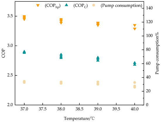 In the first period of the experimentation, the parameter testing was carried out. The heat pump temperature setpoint was varied as follows: 37 °C, 38 °C, 39 °C, 40 °C. Using the set of equations presented in Section 3.1, under different outdoor temperatures, solar radiation conditions, and heat pump setpoint temperatures, the different system outputs were obtained, including the heat pump unit heat output, Q0, the heat pump unit heating power, P0, the heat pump unit’s coefficient of performance, COPHP, the heat pump circulatory system coefficient of performance COPC, and pump consumption as a percentage of α. The results of the different system outputs are shown in Figure 7 and Figure 8.