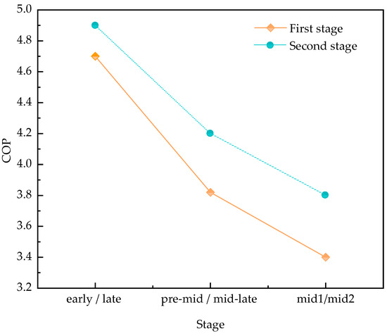 When implementing the control strategy, the coefficient of performance of the heat pump unit in the late stage of the heating period was improved by about 2.8% compared to that in the early stage of the first period. Additionally, the coefficient of performance of the system in the mid-late stage was improved by about 8.6% compared to that reported in the pre-late stage. It was also noted that the coefficient of performance of the heat pump unit in the mid-2 stage part of the second period was improved by about 6.7% compared to that in the mid-1 stage part of the first period. On average, the coefficient of performance in the second stage was improved by about 6.0% through the implementation of the control strategy.