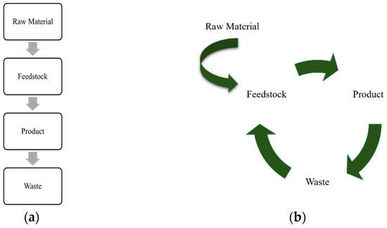 On the contrary, CE, which remarkably has been publicized lately, can be explained as “an alternative to “Linear economy” (LE) (make, use, dispose) in which we keep resources in use for as long as possible, extract the maximum value for them while in use, then recover and regenerate products and materials at the end of each service life” [,,,,]. Figure 2 depicts flowcharts of LE (Figure 2a) and CE (Figure 2b). Currently, most factories run their businesses in a linear path in which raw materials are extracted, refined, and processed into daily-needed products. However, in the past few decades, the LE has been questioned due to the warnings about Earth’s resource depletion. Hence, academia, organizations, governments, and humanity seek an obligatory transition from LE to CE.