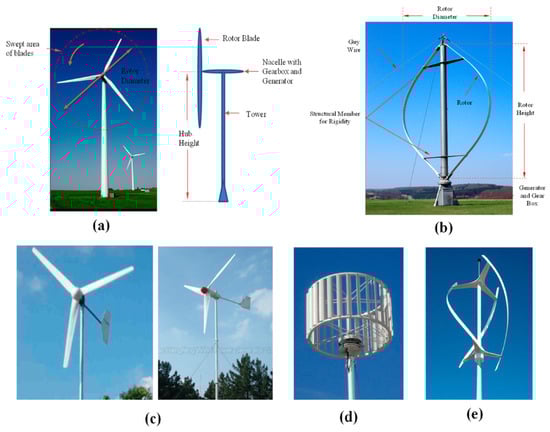 (a) Horizontal-axis turbines (HaTs), (b) vertical-axis turbines (VaTs), (c) domestic HaTs, (d) Savonius VaTs, and (e) Darrieus VaTs. Reprinted with permission from Ref. [], 2023, MDPI.