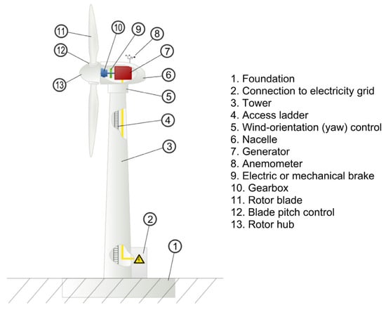 As declared before, among all alternative designs for WTs, upwind HaTs with three blades play a significant role in the wind industry sector. Figure 4 represents a typical upwind HaT with three blades and highlights every component of this form of WT [,].