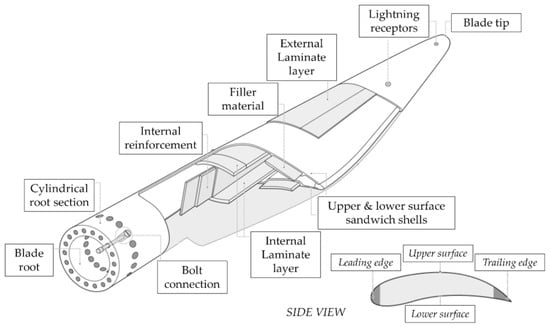 Figure 5 depicts a lateral cut of a regular WTB []. WTBs are multilateral composite structures comprising various materials with different properties. Although the material composition of WTBs may differ from one manufacturer to another, generally speaking, they are composed of the following elements described in Figure 5, as we also stated earlier in the introduction part (see Table 2).