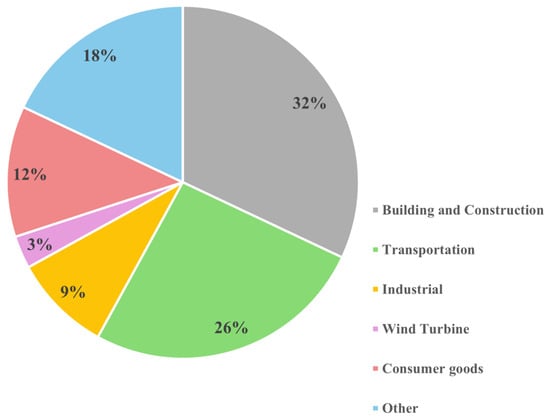 It can be concluded from Table 2 that thermoset polymeric composites are used the most compared to the rest of the materials. In thermoset polymeric composite manufacturing, more than two constituents will usually be mixed to acquire new products with superior physical and/or chemical properties compared to each component alone []. So, as the scope of this project is on thermoset polymeric composites, they can be classified by reinforcement type and subdivided into (1) particle-reinforced composites and (2) fiber-reinforced composites []. As a reminder, the formula that makes turbine blades is polymeric resins plus fabric reinforcements, known as FRP composites [,,]. In this case, 50% of the thermoset composite comprises fiber; the rest is the resin content. FRP thermoset composites can be manufactured from a numerous variety of polymeric resins and fiber reinforcements by many processing operations, with tailored engineering properties paving the way for them to play a crucial role in most high-tech industrial markets, such as the automotive, aerospace, construction, and marine sectors, and so on [,,] (see Figure 6). These advanced composites offer low density, corrosion resistance, good insulation, and high strength and stiffness []. The wind energy sector is ranked as one of the available markets for FRP thermosets [,].