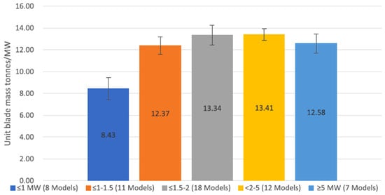 Blade mass per unit of rated power for the different turbine sizes. Reprinted with permission from Ref. [], 2018, Elsevier.