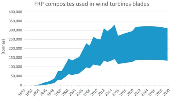 According to the statistics and market analysis of German associations AVK and CCeV, GFRPs’ volume production in Europe reached 1069 million tons in 2015, corresponding to 25% of the world’s total volume production. In addition, 34% of Europe’s production is associated with the construction sector, and the wind energy industry is also included in this category []. Compared to GFs, the global CF demand was 53,000 tons, with only 14% growth in recent years. This share is related to the construction sector, and wind power represents only 14% of this amount (7400 tons) []. Based on the EU’s binding target for increasing green energy, Figure 8 shows the projected trends and use of GFRPs in WTBs until 2030 [].