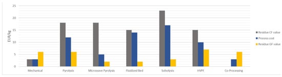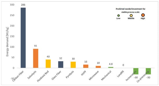 From an energy-demand point of view, generally, it is predicted that 111.88 MJ/kg is required for the fabrication of a piece of composite material. This number consists of fiber production, resin production, the pultrusion process, and additive energy requirements []. According to a study, it has been concluded that the energy demand of recycling methods is comparatively 10 to 20 times lower than the energy demand of new material production. It is stated that the production of virgin GF needs 13–32 MJ/kg of energy, whereas virgin CF consumes 183–286 MJ/kg [,,]. Figure 12 compares the individual processing energy demands of various recycling procedures. It is important to note that most recovery methods use mechanical recycling as an initial pre-treatment to downsize the blades into manageable scraps. For the amounts of energy mentioned in the diagram, no pre-processing or energy-intensive operations are included.