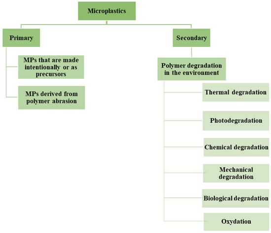 Unfortunately, the first generation of WTs, installed during the 1990s with a standard 20–25-year lifetime, will soon reach the end of their service life. Simultaneously, as declared earlier in the above paragraphs, the predicted growing demand for wind energy production, one way or another, will also intensify the number of decommissioned turbines and, thus, the world will face massive amounts of blade waste [,]. Without waste management infrastructure, the usage of traditional disposal methods continues, in which blade litter is subjected to different degradation phenomena based on composite characteristics and environmental stimuli, such as heat, UV radiation, oxidation, biofouling, and mechanical forces. These processes result in the formation of small blade scraps, designated as MPs []. MPs, less than five millimeters in size, are significant pollutants threatening wildlife and the ecosystem.