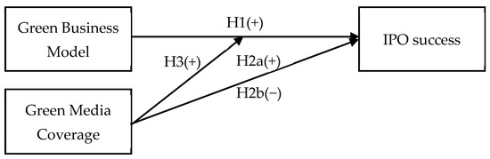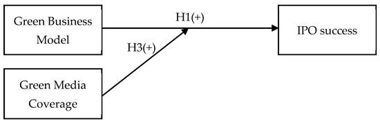 We believe that signals indicating a firm’s growth potential and sustainability significantly impact its IPO success. Therefore, this study examines the effects of two green signals: green business model (GBM) and green media coverage (GMC). First, we suggest that the GBM signals the IPO firm’s growth potential, positively affecting investors and leading to a successful IPO. A GBM is defined as a business approach that prioritizes environmental sustainability as a core value while creating economic and social value [9]. In this study, a GBM refers to a business model designed to capture profits by implementing green practices. Furthermore, we propose that GMC delivers positive or negative signals that can change investors’ perceptions of IPO firms and ultimately affect IPO performance. Green media is known as the media that educates and communicates environmental issues to the public and encourages local communities to participate in them [10]. In this study, GMC refers to the reporting of a firm’s green practices and environmental performance in the media. Figure 1 shows the research model of this study.