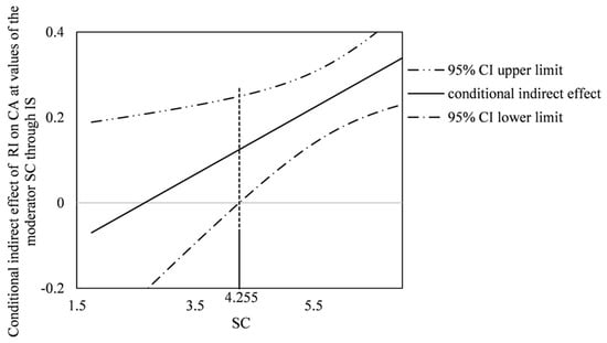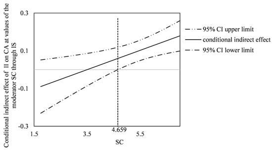 To better clarify the interactions, we used the Johnson–Neyman technique [89] to calculate the regions of significance to provide a simple slope test for the moderated relationship. The significance region is described as the point at which the confidence interval is wholly above or below 0. As illustrated in Figure 2, regions of significance showed that, for non-centered 7-point supportive culture values above 4.659, 77.61% of cases fall within the significance regions. These results indicate that the indirect positive relation between incremental innovation and competitive advantage through innovation speed becomes significant. This provides support for H4a.
