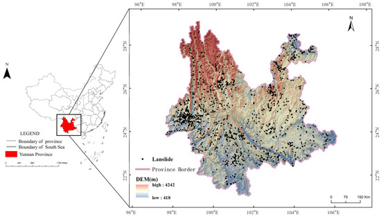 Yunnan Province is situated in the southwest of China, covering an area of approximately 390,000 km2 and extending between 97°53′ E and 106°20′ E in longitude and 21°14′ N and 29°25′ N in latitude (Figure 1). The study area is located at the boundary between the Indian Ocean Plate and the Eurasian Plate, characterized by active tectonic movements and complex lithological formations. Bounded by the Red River Fault, the eastern part comprises karst plateaus, while the western part consists of high mountain valleys. Under the influence of internal and external geological forces, near-surface rocks and soils are fragmented, resulting in high instability. The topography of Yunnan Province is predominantly mountainous, with some hills and plains. The elevations in the study area vary significantly, ranging from a maximum of 6740 m to a minimum of 76.4 m above sea level. The climate in the study area is classified as tropical monsoon, with an average annual maximum temperature of approximately 23 °C, minimum temperature around 7 °C, and average annual rainfall of about 1086 mm. Rainfall is concentrated mainly from May to October, accounting for 85% of the total annual precipitation. With rapid urbanization and infrastructure development, human activities are increasingly impacting the geological environment. Meanwhile, frequent extreme weather events and increased seismic activity contribute to the persistent trend of multiple and frequent landslide disasters.