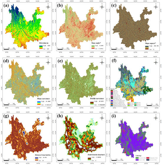 Landslide occurrence is closely related to the combined effects of various factors, including topography, geological structure, and environmental factors. A proper combination of susceptibility factors can enhance the competitiveness of the model [27]. Different topographic features influence rock weathering, vegetation coverage, and soil moisture, thereby affecting slope stability [28,29]. Geological structures affect the stability of strata and rock structures, thereby increasing the risk of landslides [30]. Environmental factors directly impact soil stability and hydrological processes, consequently affecting slope stability [29,31]. Yong C et al. [32] summarized the importance of factors for landslide susceptibility of different causes. Taking into account the evaluation factors in the aforementioned study and the uniqueness of the research area, the following 16 regulating factors were selected: elevation, slope angle, slope aspect, plane curvature, profile curvature, soil types, distance from fault, fault density, lithology, land use, normalized difference vegetation index (NDVI), distance from river, river density, average annual precipitation, distance from road, and road density (see Figure 2). As the 16 evaluation indicators are represented in different forms or scales, all evaluation indicators were standardized into 30 m × 30 m raster data using the ArcGIS10.2. Multilinearity tests were performed on the selected feature factors using stepwise regression [33]. The tolerance and variance inflation factor (VIF) results indicated that all feature factors had tolerance values greater than 0.1 and VIF values less than 10, indicating low collinearity among the factors and good independence.