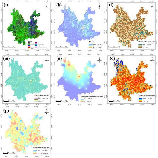 Illustration of conditioning factors: (a) elevation; (b) slope angle; (c) slope aspect; (d) plane curvature; (e) profile curvature; (f) soil type; (g) distance from fault; (h) fault density; (i) lithology; (j) land use; (k) NDVI; (l) distance from river; (m) road density; (n) average annual precipitation; (o) distance from road; and (p) river density.