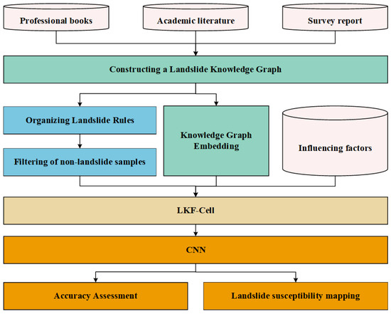 To address the above issues, in this study, a landslide knowledge graph is first constructed to describe landslide mechanisms and summarize and generalize landslide susceptibility rules. Then, combining the landslide rules with the geographical similarity of samples, high-confidence non-landslide samples are filtered out. Subsequently, the LKF-Cell method is employed to couple landslide data with landslide knowledge, resulting in landslide event characteristics that are informative and semantically rich. Finally, an accurate and reliable landslide susceptibility assessment model is constructed based on a convolutional neural network, and the spatial distribution level of landslide susceptibility is mapped.