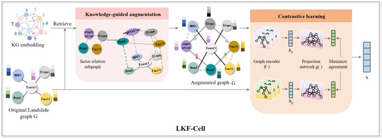 To enhance the model’s understanding of landslide domain knowledge, an LKF-Cell was designed with the aim of integrating external knowledge with landslide subgraphs, as a basis for subsequent knowledge-guided landslide susceptibility prediction. Detailed information of the LKF-Cell is illustrated in Figure 5. A contrastive learning framework was employed to learn representations of landslide event subgraphs. Notably, a knowledge-guided graph augmentation method was proposed to construct positive pairs in the contrastive learning stage, which enabled the model to capture not only the deep features of landslide event subgraphs but also the knowledge structure and semantic relationships of landslides. The input to the LKF-Cell consists of knowledge embeddings from LandslideKG and true landslide event subgraphs, with the landslide event subgraph G being composed of selected influencing factors. The output is the updated features of landslide subgraphs fused with external knowledge, denoted as