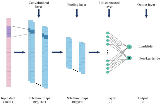 CNNs are among the most widely used deep learning algorithms. In this section, the CNN model serves directly as a classifier for LSM. First, a one-dimensional factor vector was input and, after undergoing convolution and pooling operations in the hidden layers, the extracted high-dimensional landslide information was mapped to a low-dimensional feature space through fully connected layers. Finally, through applying a non-linear activation function, the information was mapped to the sample label space, outputting landslide and non-landslide labels along with their corresponding probability values. With filters = 10, kernel_size = 3, learning_rate = 0.001, pool_size = 2, and activation = “tanh”, Figure 6 illustrates the architecture of the used 1D-CNN.